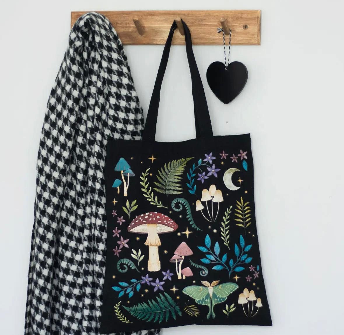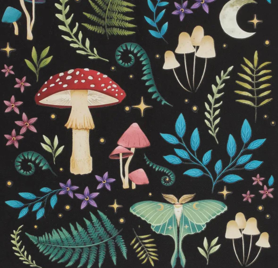 Draag de charme van de natuur duurzaam overal mee naartoe met deze draagtas. Versierd met een etherisch donker bosontwerp inclusief mystieke paddenstoelen, een gloeiende maanmot en magische planten. De duurzame, zwarte draagtas van polykatoenen canvas biedt voldoende ruimte om mee te nemen als dagelijkse tas of om te winkelen.