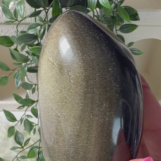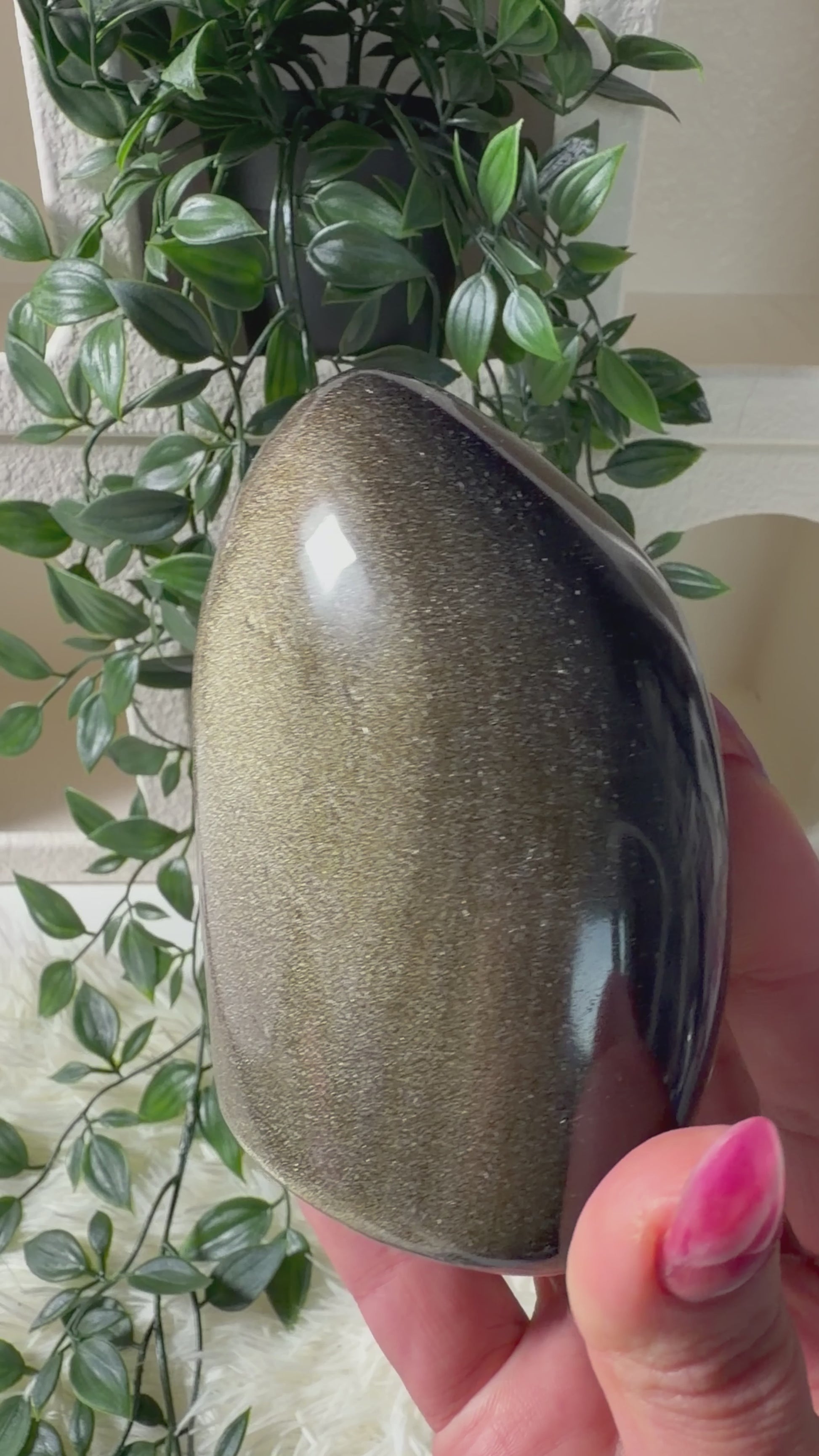 De Gouden Obsidiaan freeform straalt subtiel met haar gouden glans en diepe zwarte kleur. Bekend om haar beschermende en aardende energie, helpt ze negatieve invloeden los te laten en innerlijke kracht te versterken.