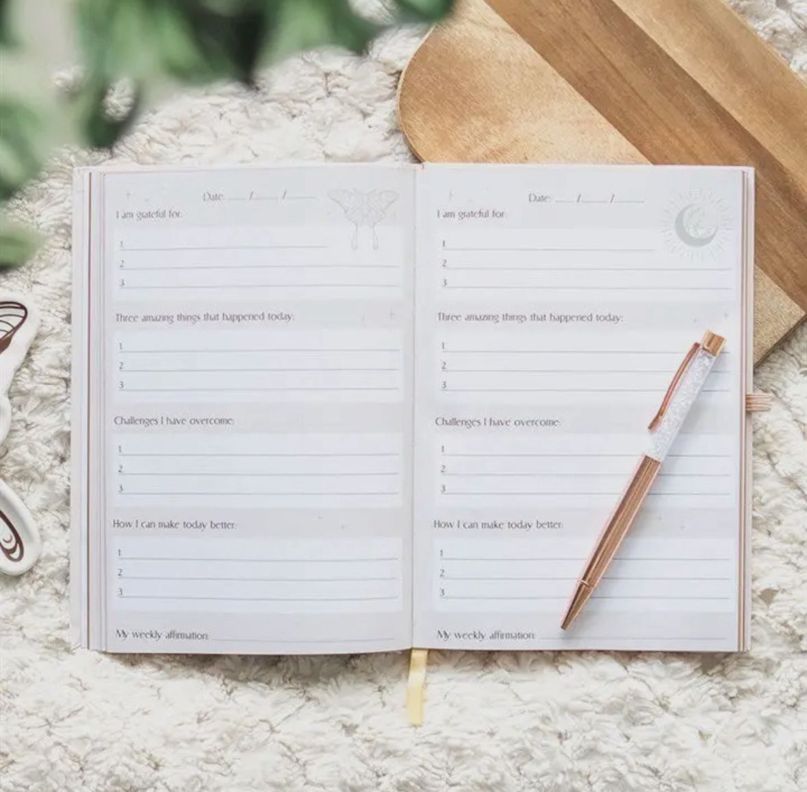 Maak verbinding met je innerlijke gedachten met dit dagelijkse reflectiedagboek. Noteer dagelijkse reflecties, dankbaarheidsoefeningen en de verkenning van je dromen met een bijpassende heldere kwartspen voor het bevorderen van helderheid en positieve energie. Met een elegant maanmot-ontwerp dat symbool staat voor innerlijke leiding en intuĂŻtie, is dit dagboek precies wat je nodig hebt om je beste zelf te manifesteren.
