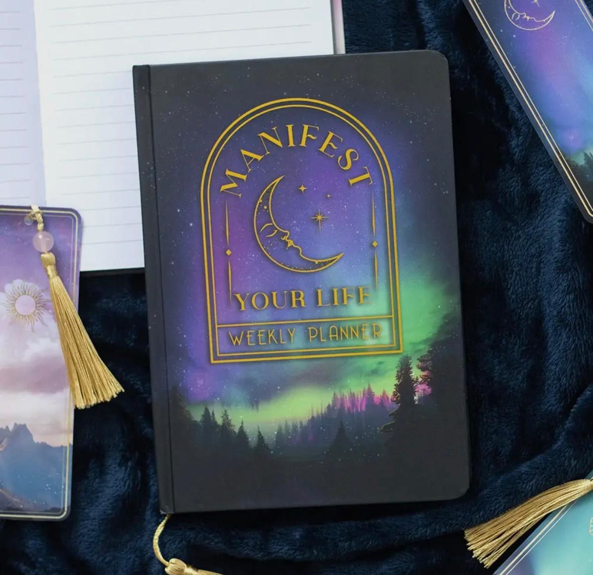 Blijf georganiseerd en geïnspireerd met dit magische A5-weekplanner-notitieboek dat de geest opbeurt met elke pagina. De omslag toont een betoverend boslandschap met de woorden 'Manifest your life' en een delicate maanafbeelding in goudfolie. Holografische randen voegen een vleugje charme toe, terwijl een gouden kwastje als bladwijzer een handige toevoeging is om de plaats bij te houden. Ideaal voor het stellen van intenties en het plannen van de komende week, combineert dit notitieboek schoonheid en doel perfect voor iedereen die klaar is om hun dromen tot leven te brengen.