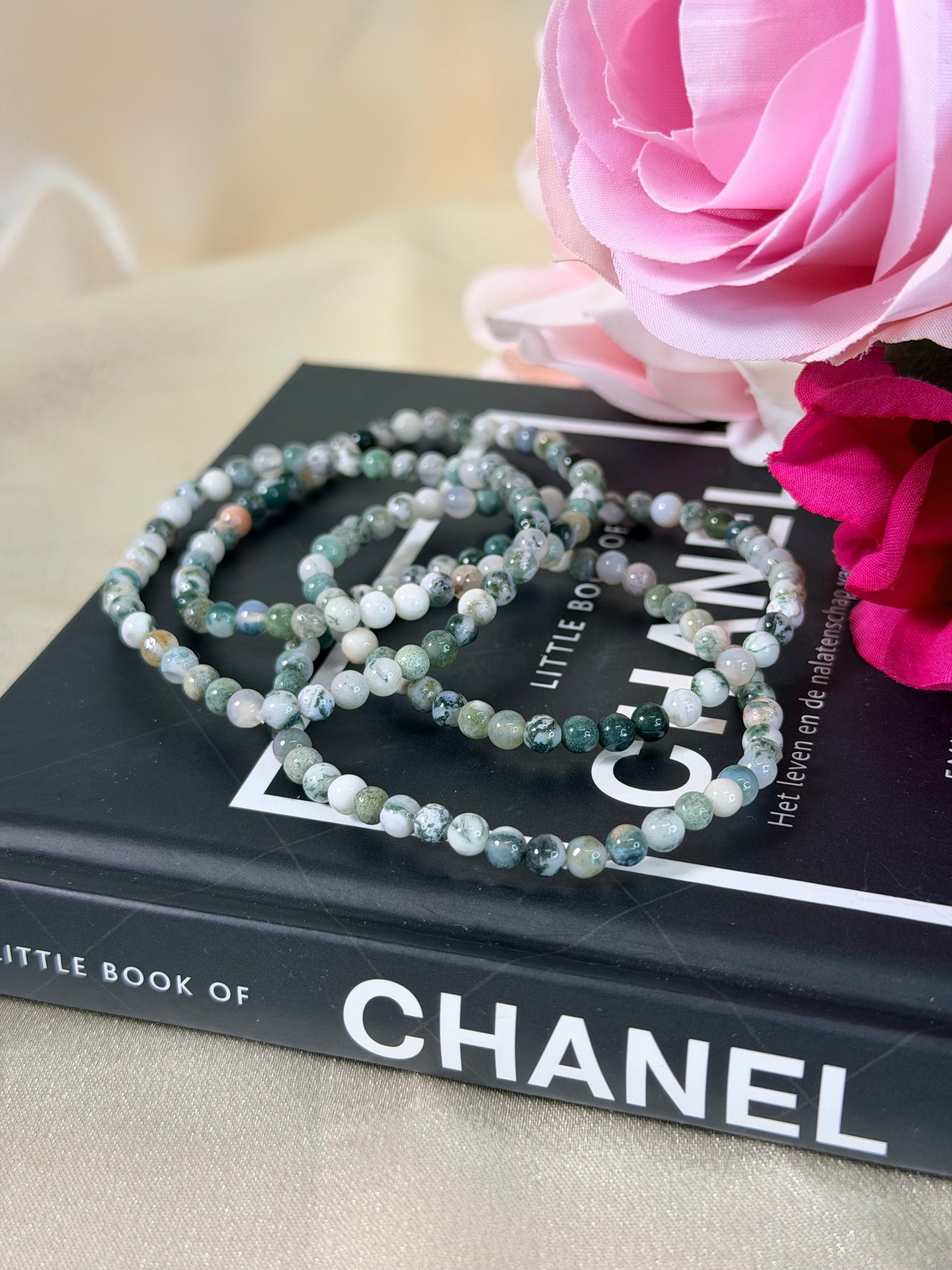 Mosagaat is een aardende edelsteen die verbonden is met de natuur en nieuwe groei symboliseert. Hij brengt innerlijke rust, stabiliteit en helpt stress los te laten. Deze groene steen versterkt je verbinding met de aarde en bevordert optimisme, balans en welvaart.