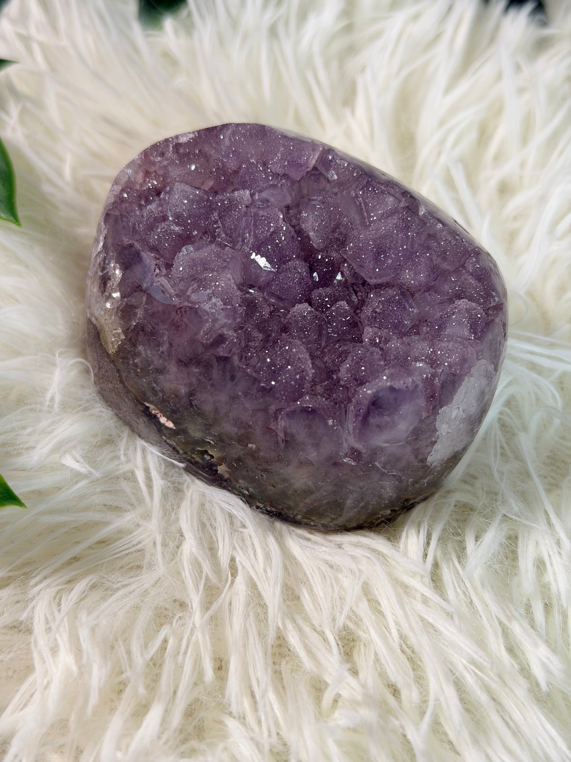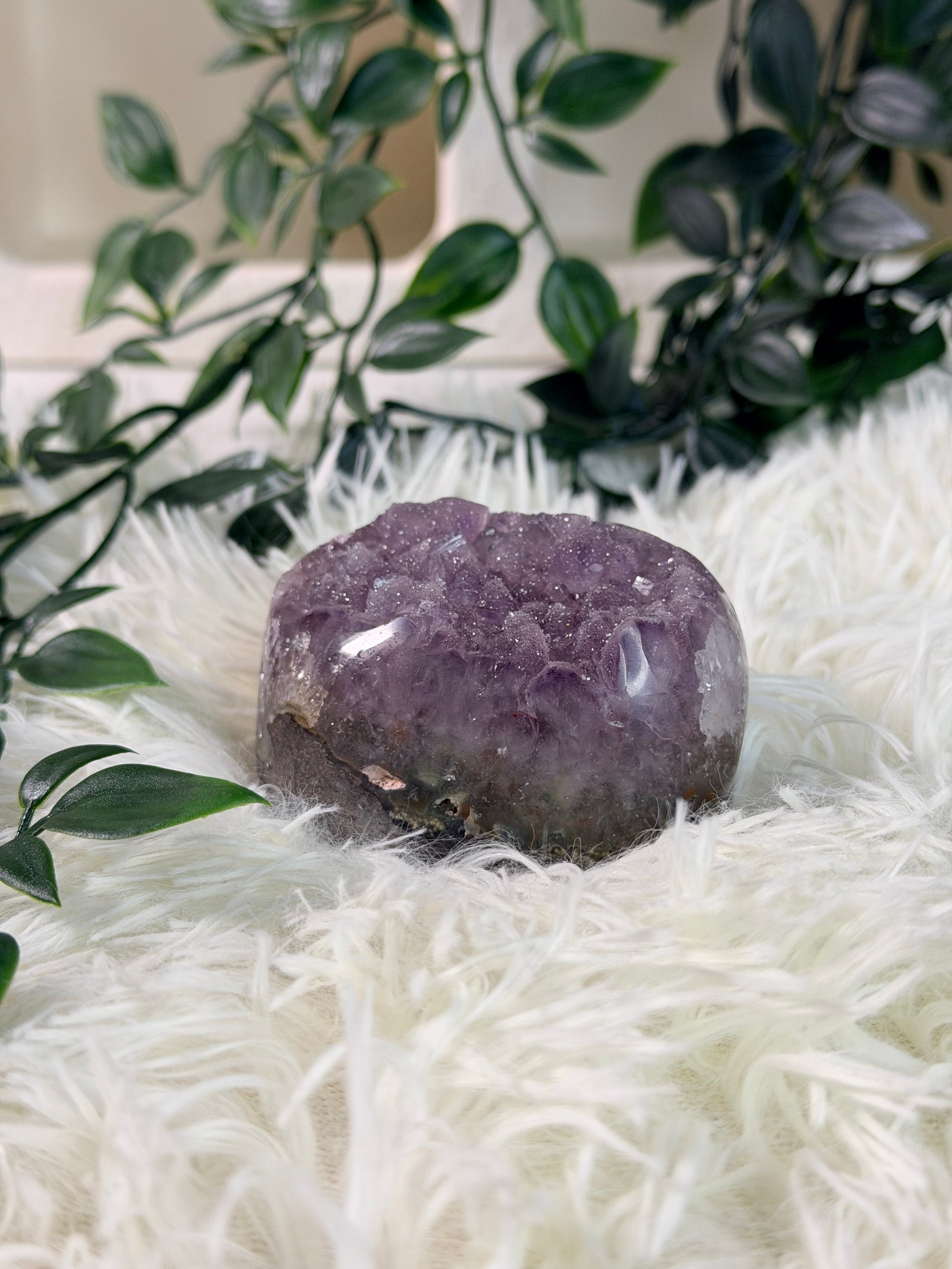 Deze Sugar Druzy Amethist heeft een prachtige paarse kleur met een fijne, suikerkristalachtige glans die schittert bij elk licht.