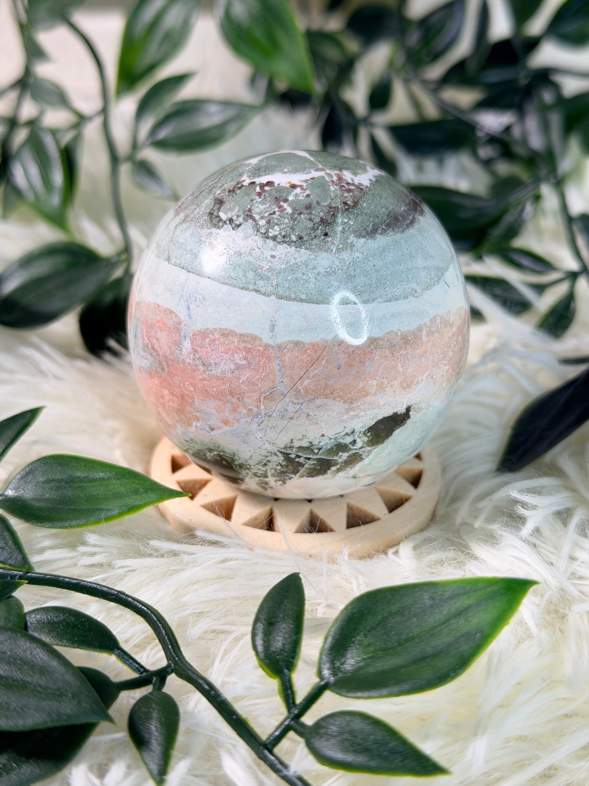 De Unicorn Jaspis bol valt op door haar speelse mix van pastelkleuren en natuurlijke patronen. Deze steen staat bekend om haar positieve en rustgevende energie en brengt een vleugje vrolijkheid in elke ruimte. Elk exemplaar is volledig uniek.