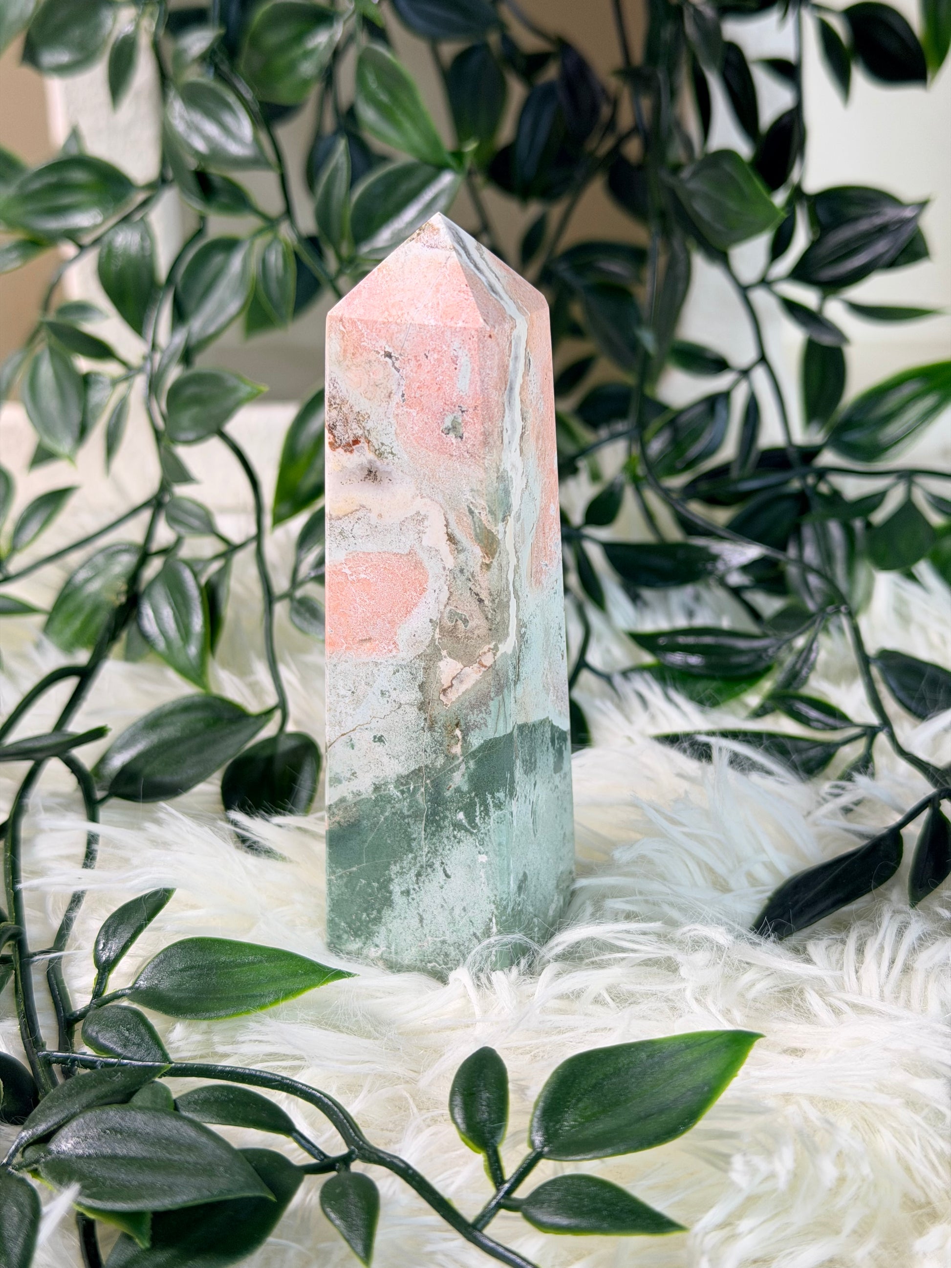 De Unicorn Jaspis toren valt op door haar speelse mix van pastelkleuren en natuurlijke patronen. Deze steen staat bekend om haar positieve en rustgevende energie en brengt een vleugje vrolijkheid in elke ruimte. Elk exemplaar is volledig uniek.