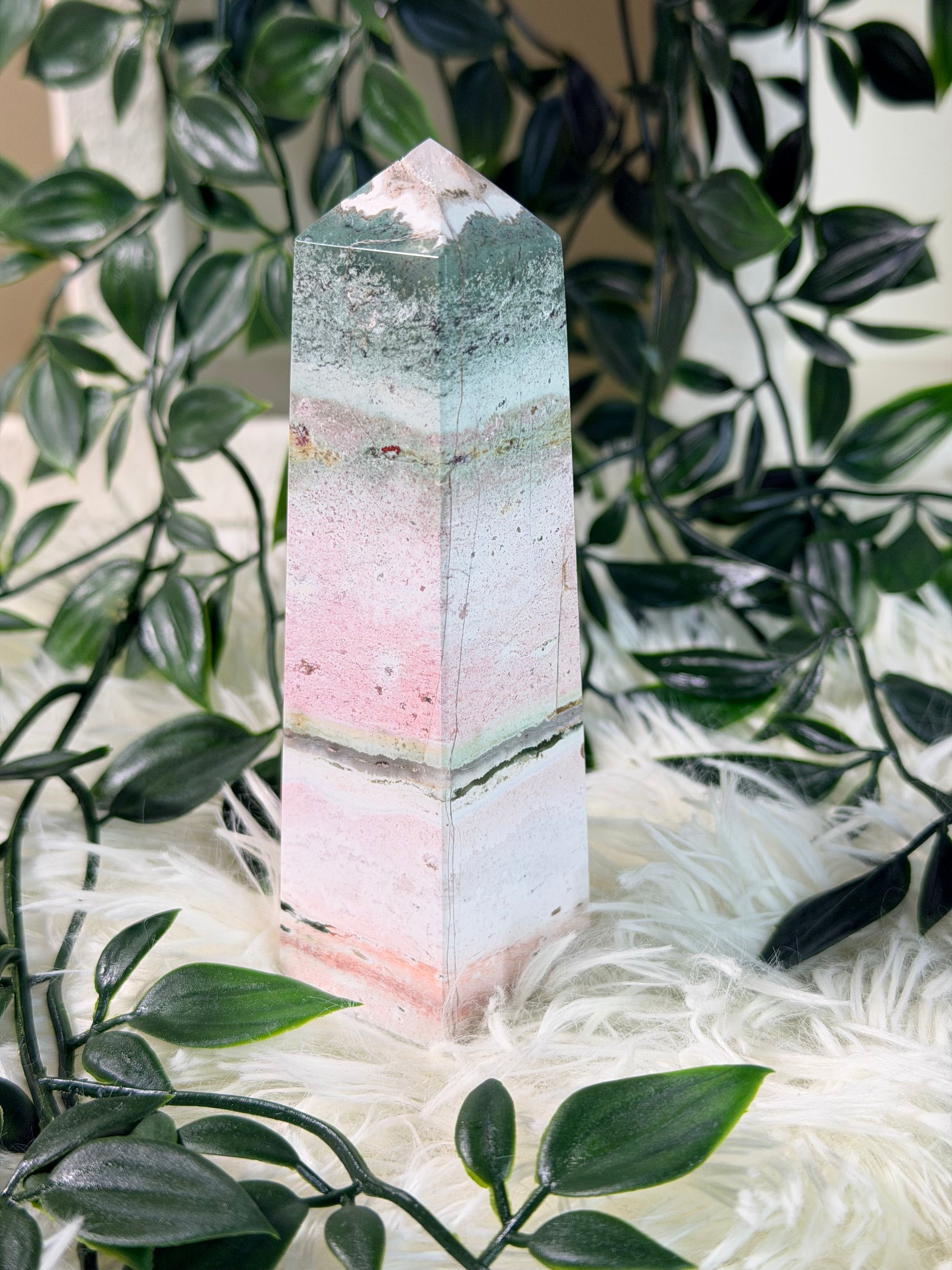 De Unicorn Jaspis toren valt op door haar speelse mix van pastelkleuren en natuurlijke patronen. Deze steen staat bekend om haar positieve en rustgevende energie en brengt een vleugje vrolijkheid in elke ruimte. Elk exemplaar is volledig uniek.