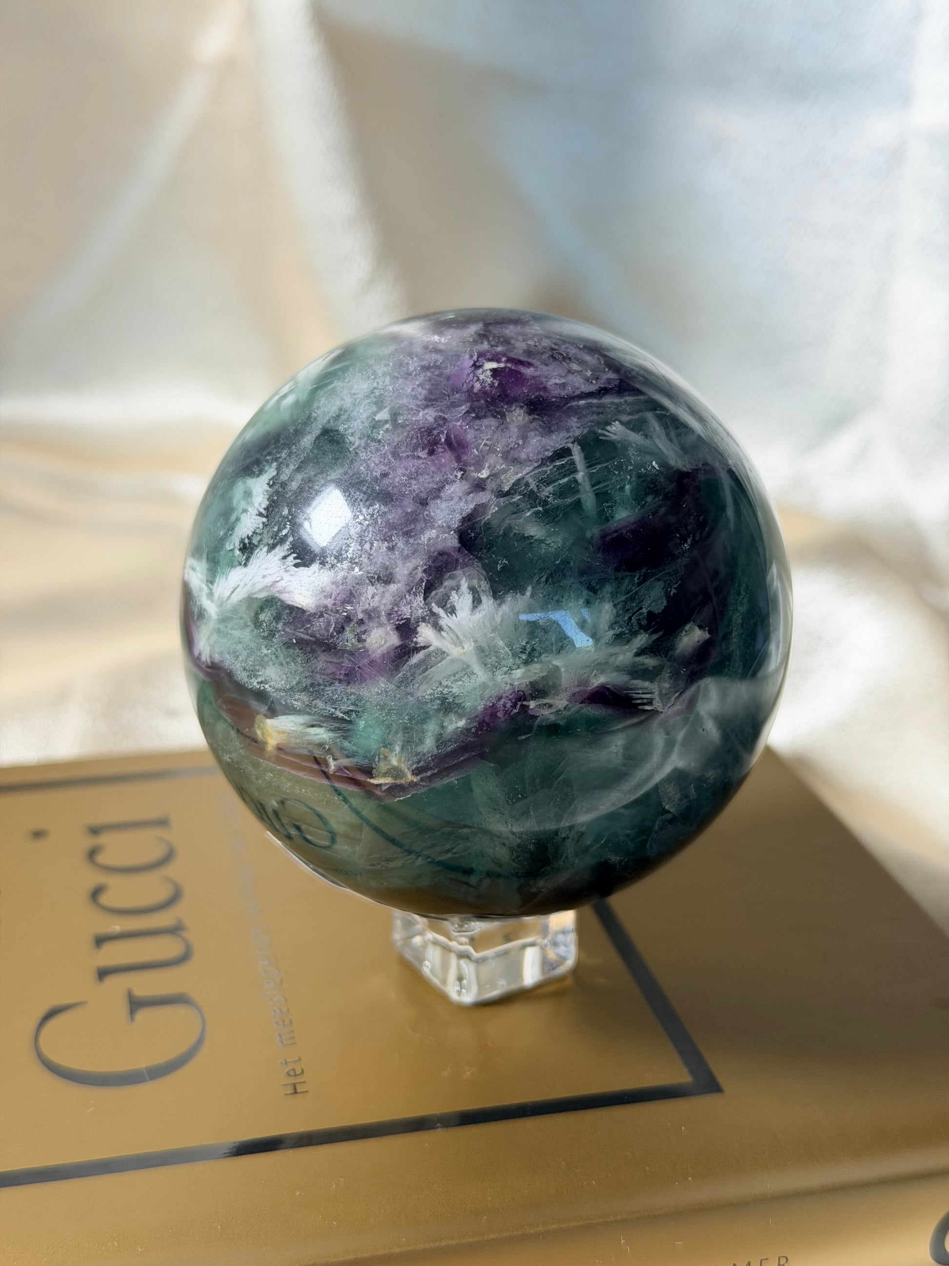 Veren fluoriet is een zeldzame variant van fluoriet met veerachtige insluitsels die ontstaan wanneer minuscule mineralen of gassen in het kristal groeien. Elke steen is uniek en straalt natuurlijke magie uit.