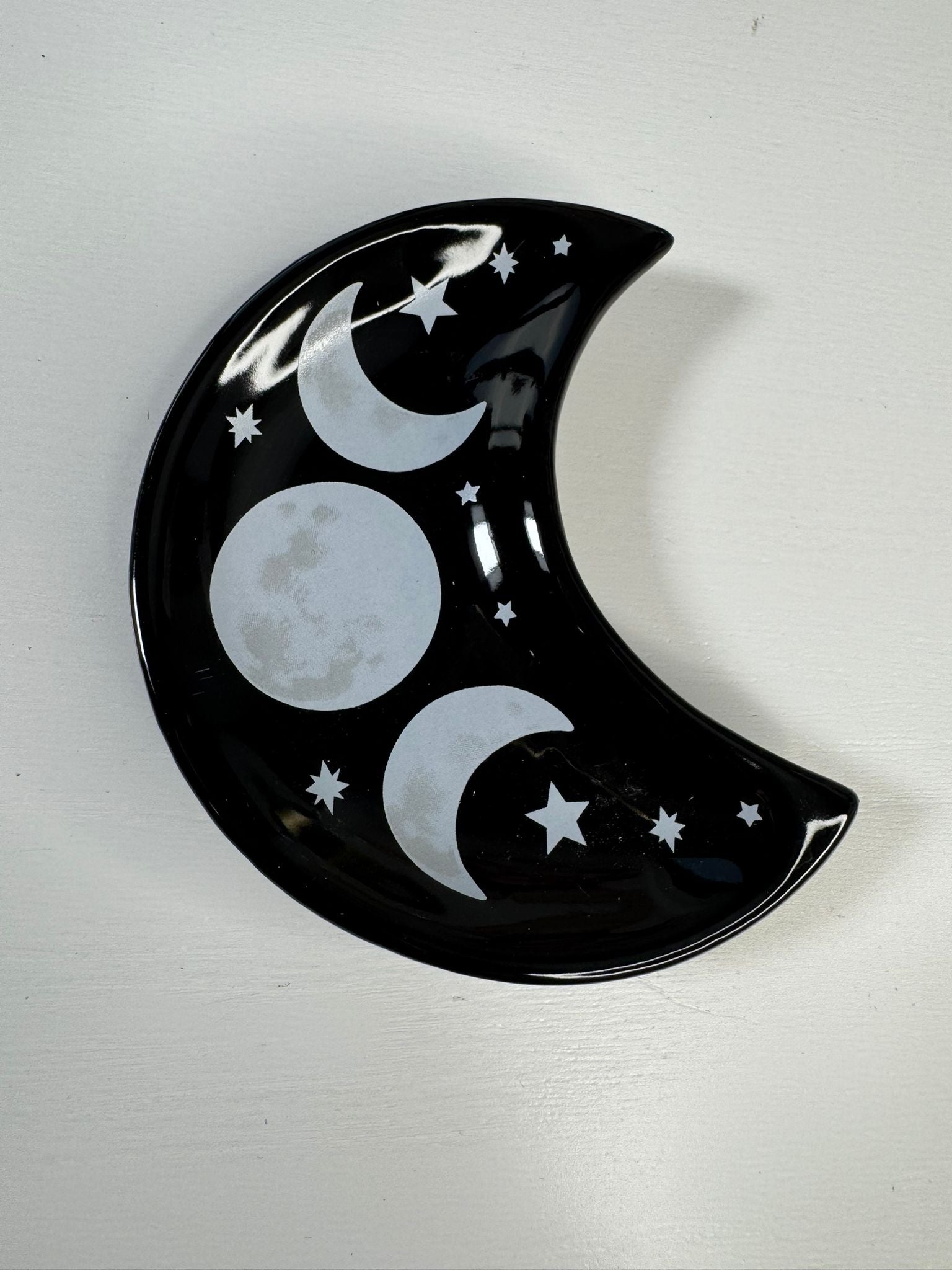 Mystiek zwart schaaltje in maansikkel vorm, versierd met maan- en stermotieven. Ideaal voor sieraden, kristallen of als sfeervolle decoratie.